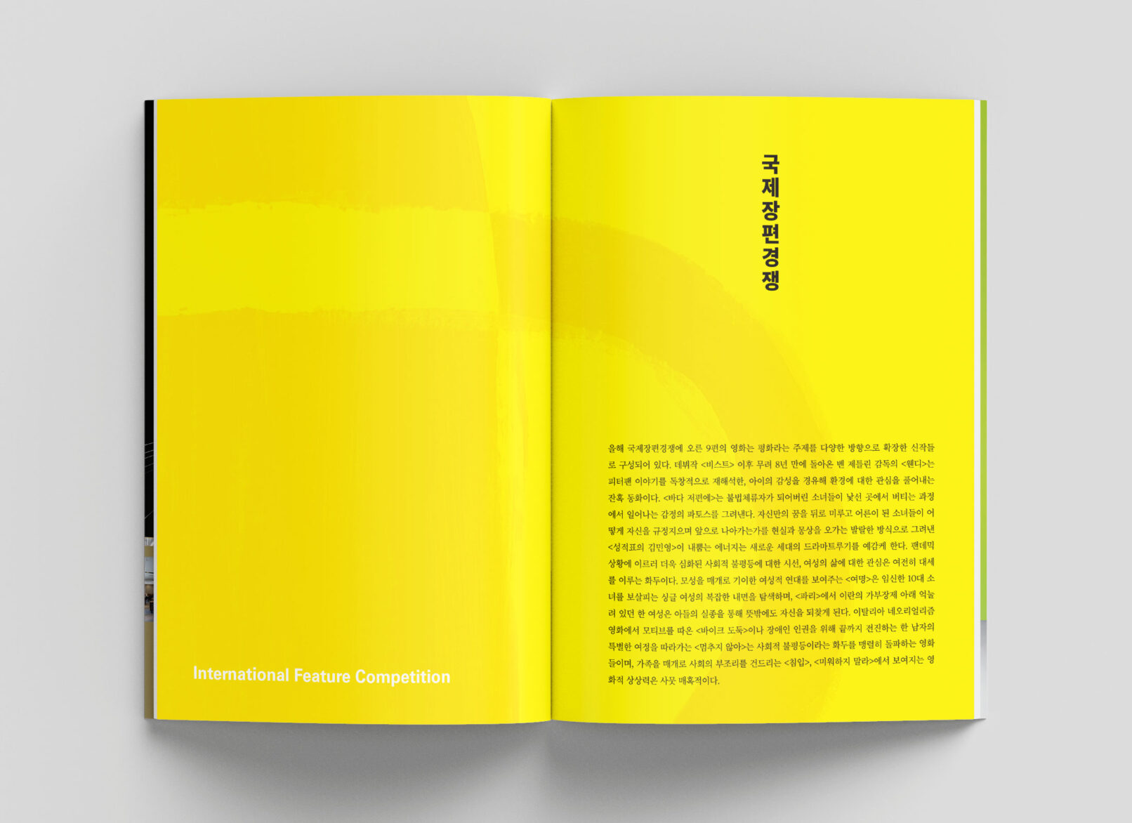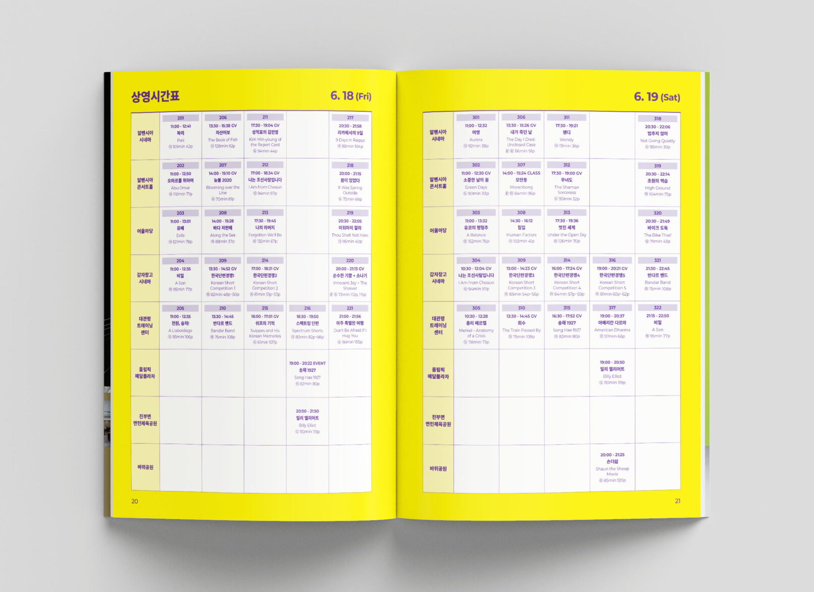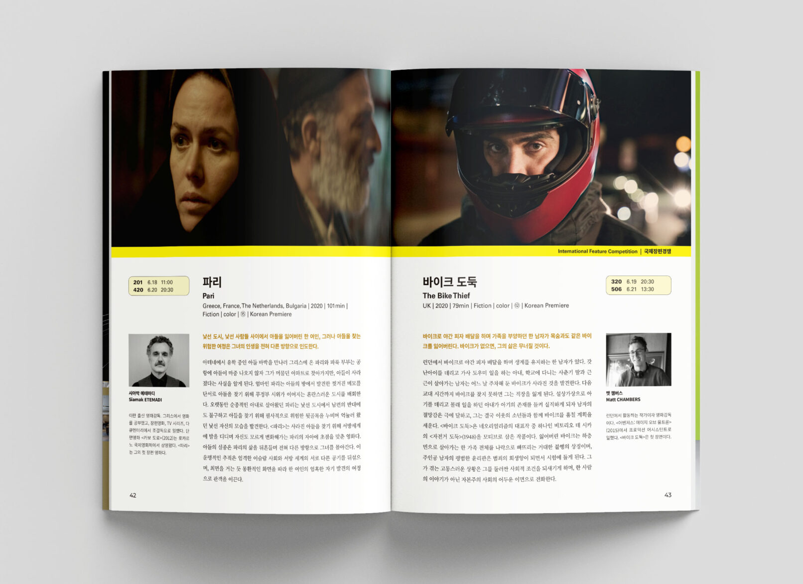 국/영문을 함께 표기하던 이전과 달리, 올해는 국문으로만 구성하여 출품된 영화들에 대한 내용을 보다 충실하게 담아내고자 하였다. 판데믹으로 인해 해외 관객이 참여하지 못하는 현실적인 부분의 고려도 있었지만, 향후 정상화된 이후에도 보다 충실한 정보 제공과 휴대성을 높이는 측면에서 국문과 영문 카탈로그를 따로 제작하는 경우에 대해 테스트해 볼 수 있는 기회가 되었다.
